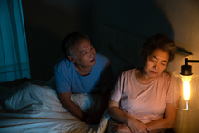 图片标题: 老年夫妇坐在床上用平板电脑看视频