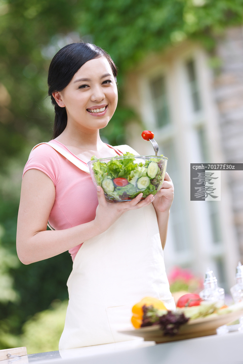 图片标题: 东方女人在户外厨房吃蔬菜沙拉