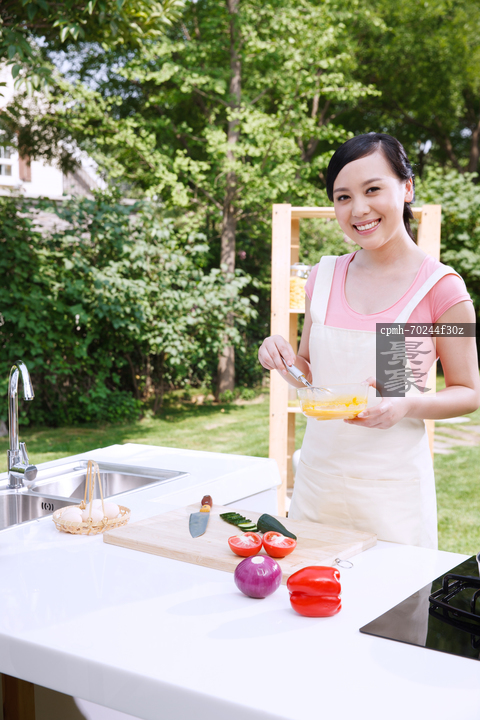 图片标题: 东方女人在户外厨房准备食物