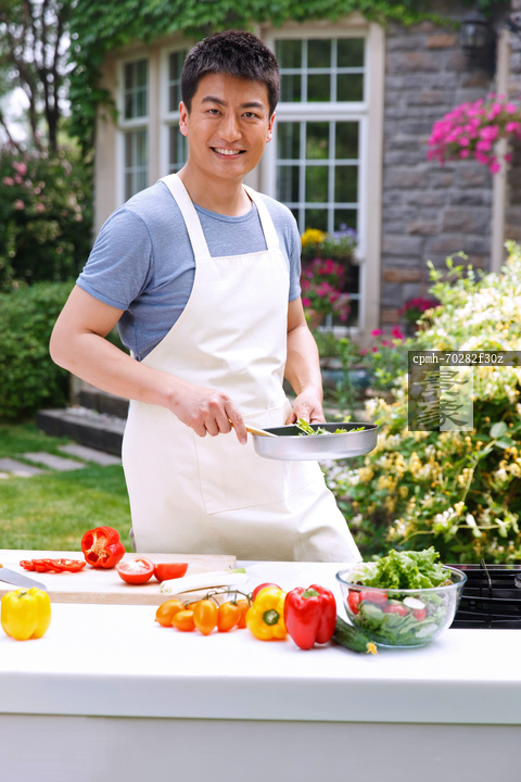 图片标题: 居家男人在户外厨房炒菜