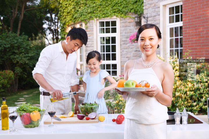 图片标题: 三口之家在花园聚餐