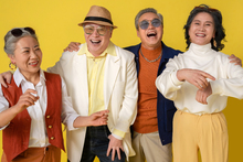图片标题: 快乐老人推着坐在购物车里的老伴