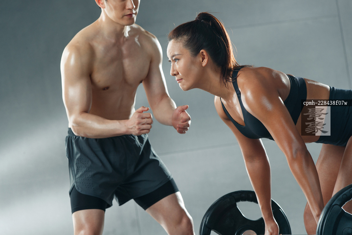 图片标题: 青年女人在教练的指导下举重训练