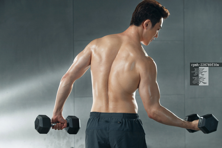 图片标题: 青年男人在健身房举哑铃