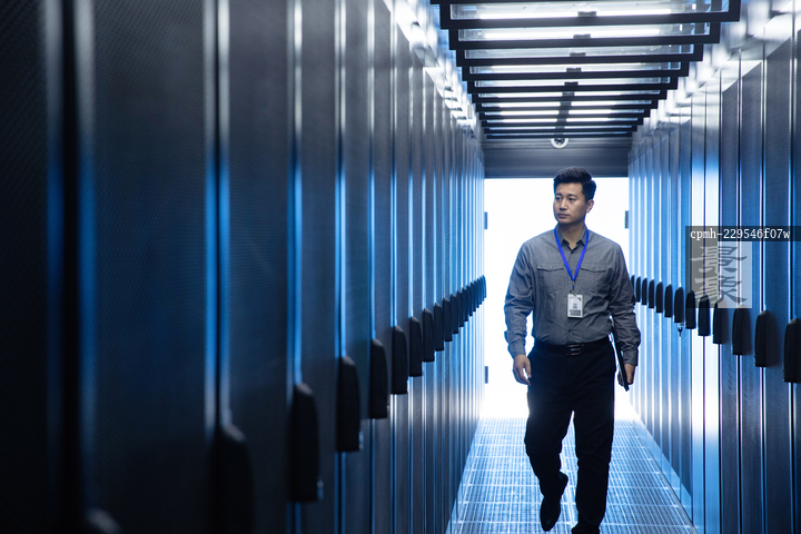 图片标题: 技术人员在机房里检查
