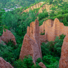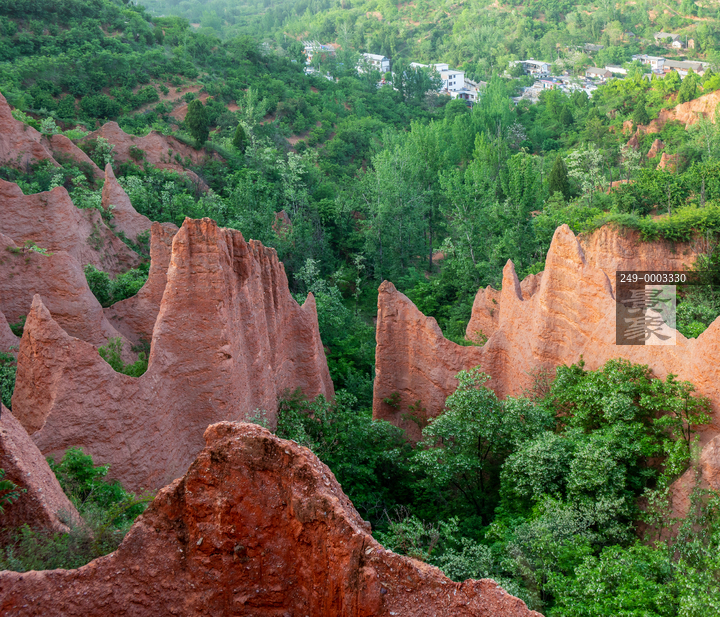 图片标题: 绿色丛林簇拥的丹霞地貌景观