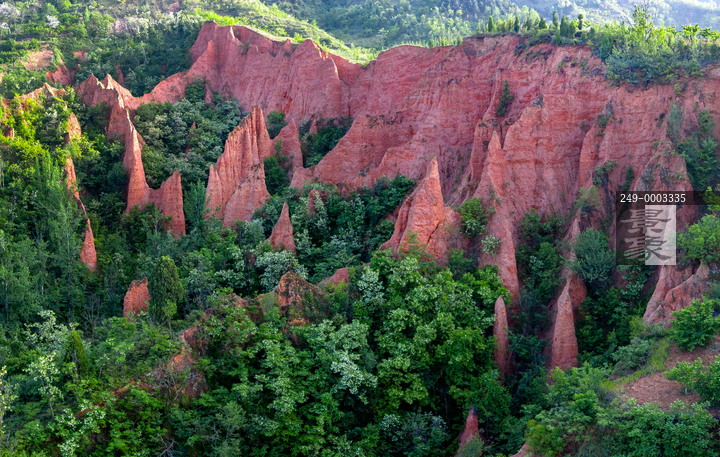 图片标题: 绿色丛林簇拥的丹霞地貌景观