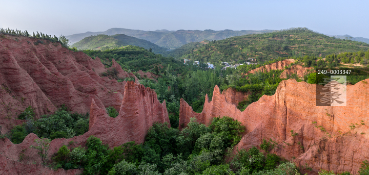 图片标题: 绿色丛林簇拥的丹霞地貌景观