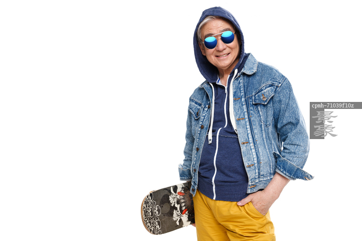 图片标题: 时尚的老年男人拿着滑板
