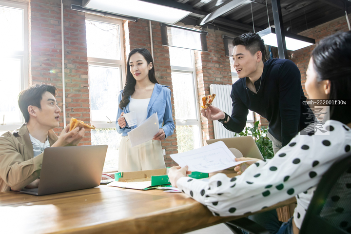 图片标题: 青年商务团队在办公室里边用餐边工作