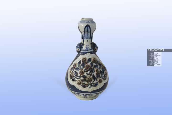 图片标题:     元青花釉里红堆塑虫草花卉纹蒜头瓶(正面)