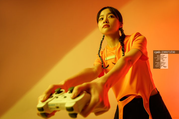 图片标题: 拿着游戏手柄的个性年轻女孩