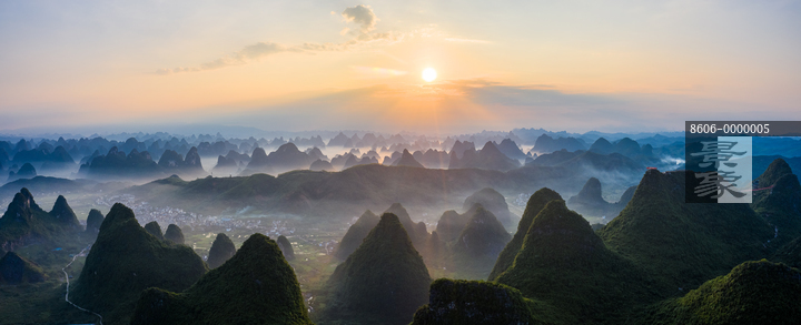 图片标题:     桂林南方喀斯特地貌晨雾日出风光