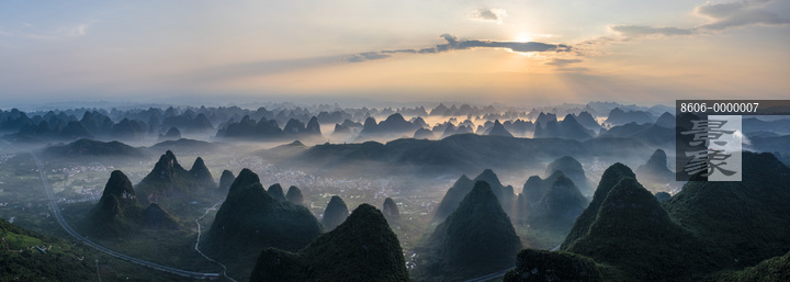 图片标题:     桂林南方喀斯特地貌晨雾日出风光