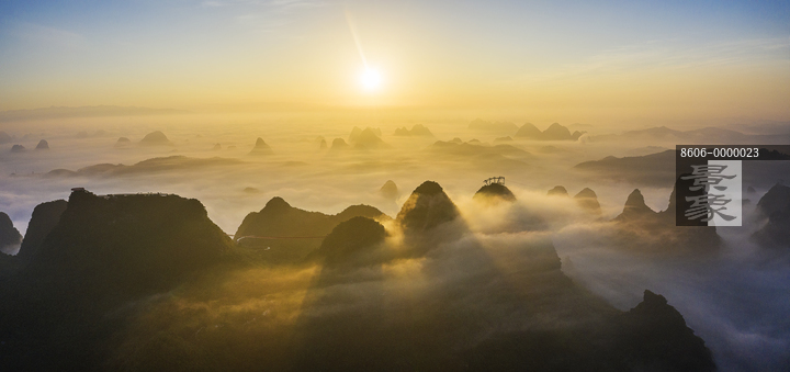 图片标题: 桂林南方喀斯特地貌晨雾日出风光