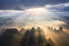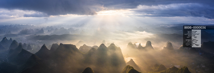 图片标题: 桂林南方喀斯特地貌晨雾日出风光