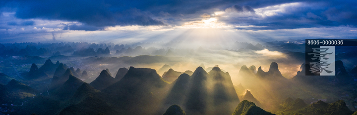 图片标题: 桂林南方喀斯特地貌晨雾日出风光