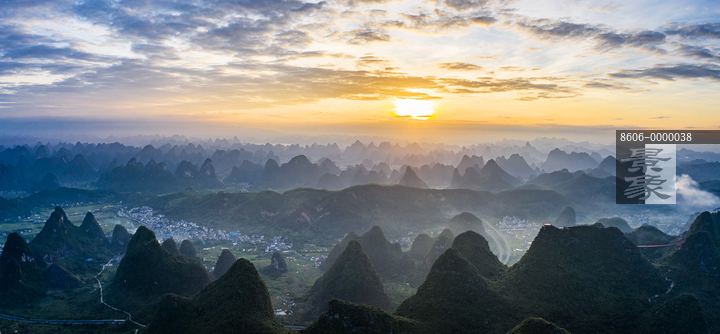 图片标题:     桂林南方喀斯特地貌晨雾日出风光