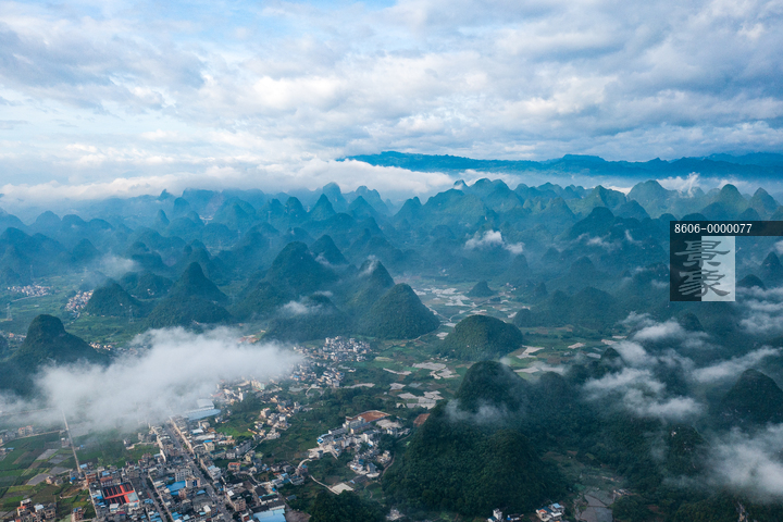 图片标题: 桂林南方喀斯特地貌晨雾日出风光