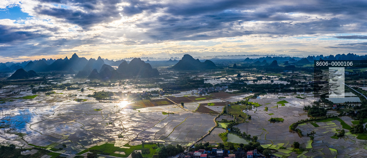 图片标题: 广西桂林临桂会仙水田晨雾日出反射风光