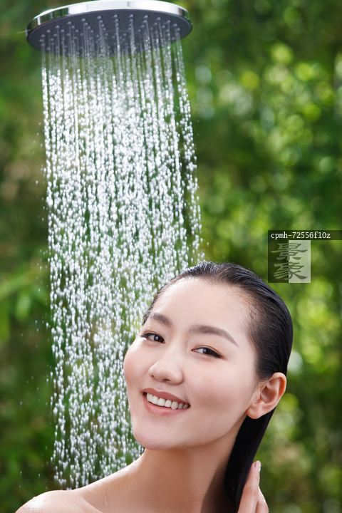 图片标题: 年轻女人在户外淋浴
