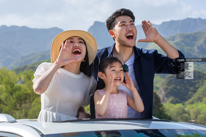 图片标题: 快乐家庭站在汽车上大声呼喊