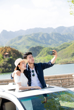 图片标题: 快乐家庭站在汽车上看风景