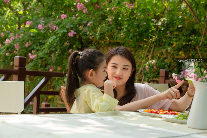 图片标题: 幸福母女在庭院吃水果