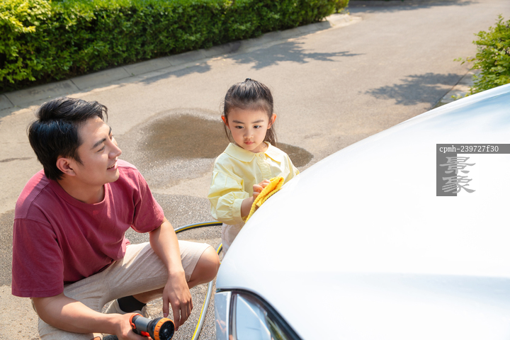 图片标题: 快乐父女擦洗汽车