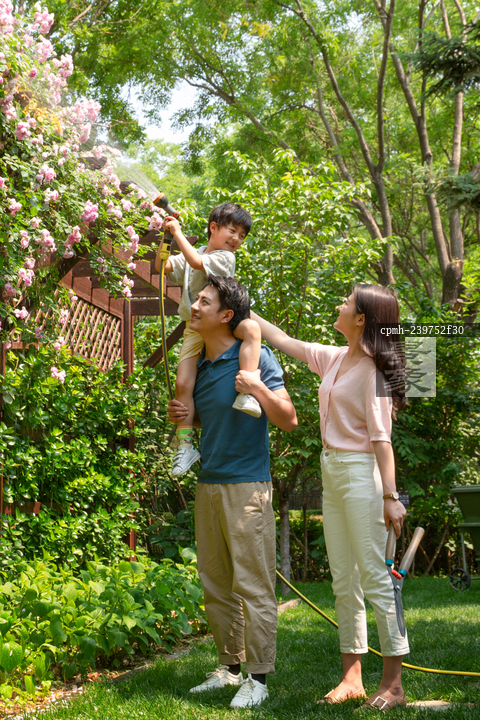 图片标题: 幸福的一家三口在院子里浇水