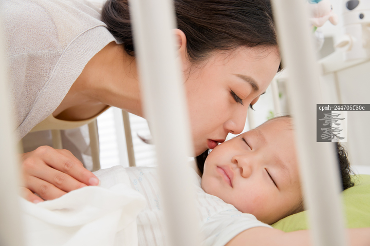 图片标题: 年轻妈妈亲吻睡觉的宝宝