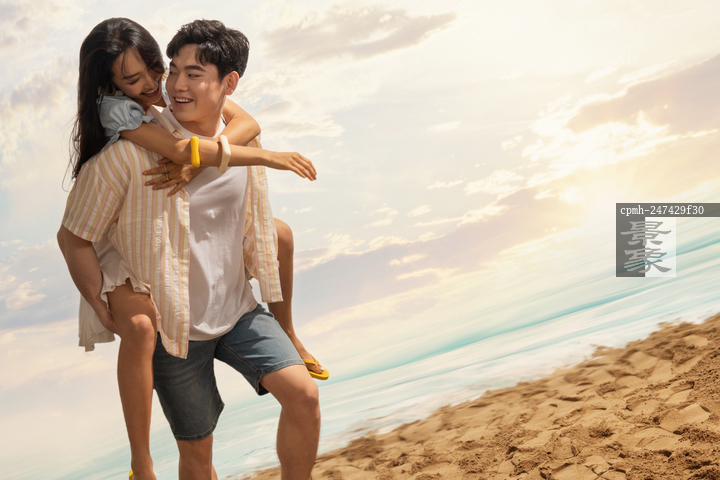 图片标题: 青年情侣在沙滩上背着散步